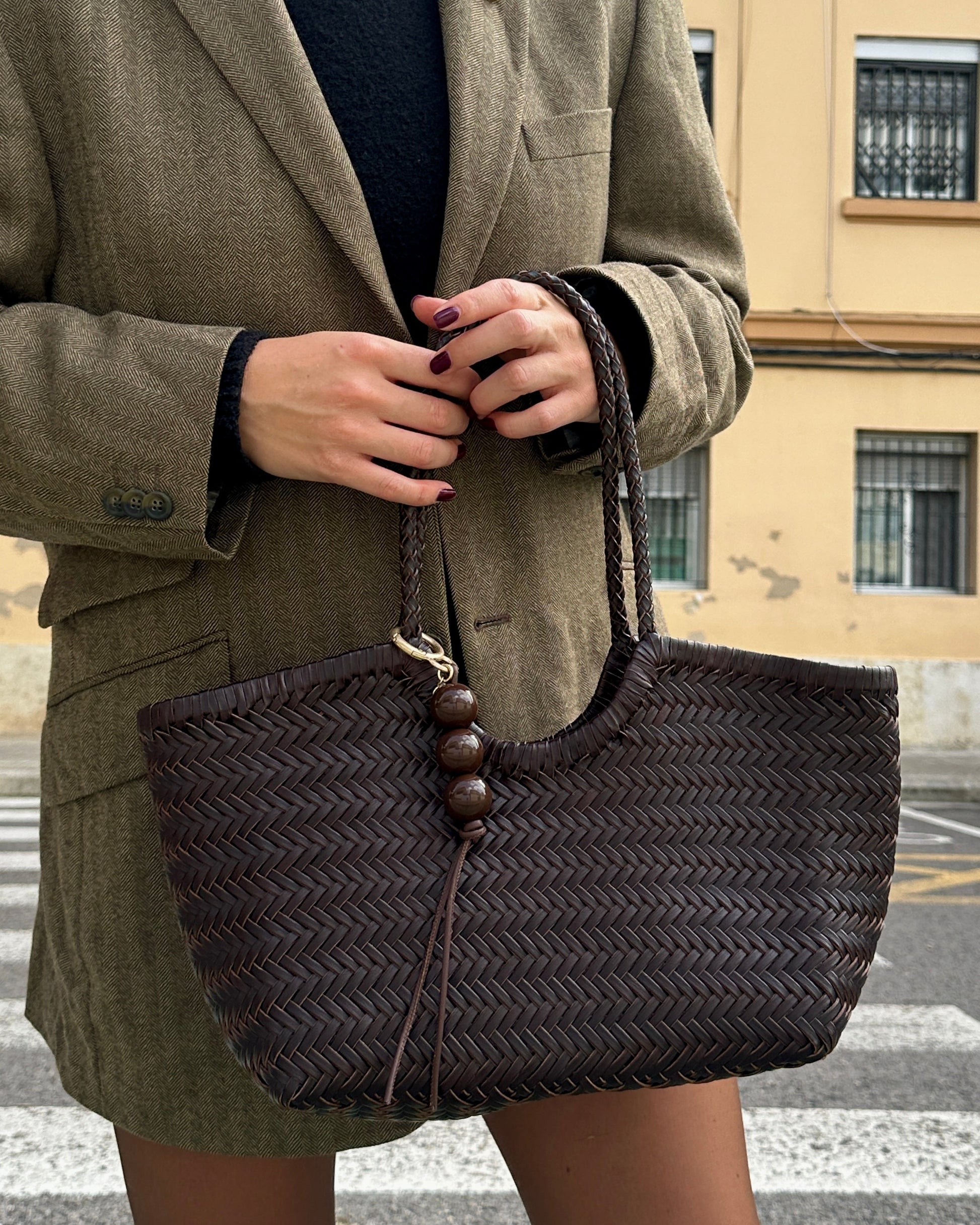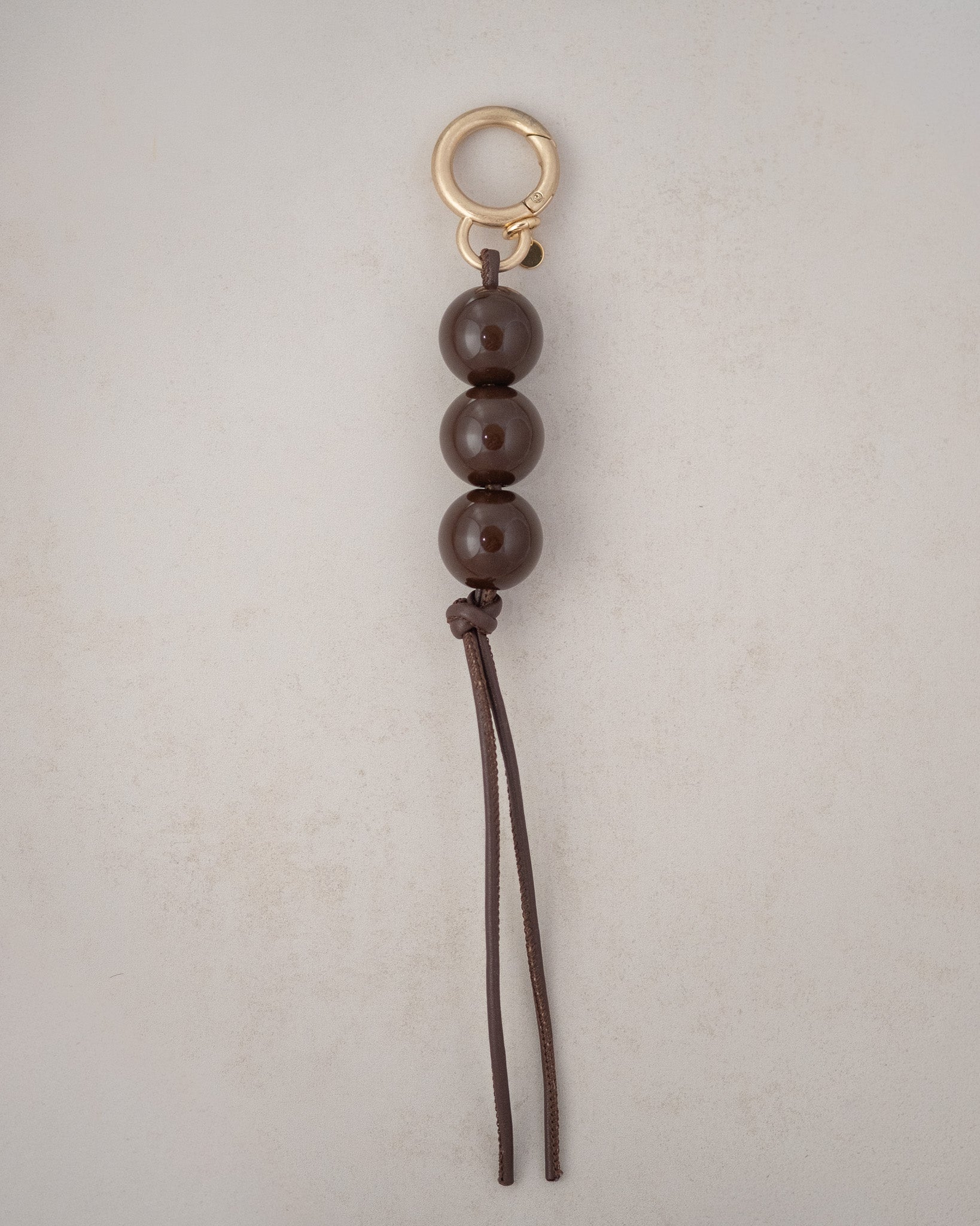 A statement piece from the Where Past Whispers collection collection. Soft lamb leather meets glossy resin beads in brown tones that catch the light with every move. Clip it to your bag or belt loop to add a touch of effortless edge and quiet sophistication.
