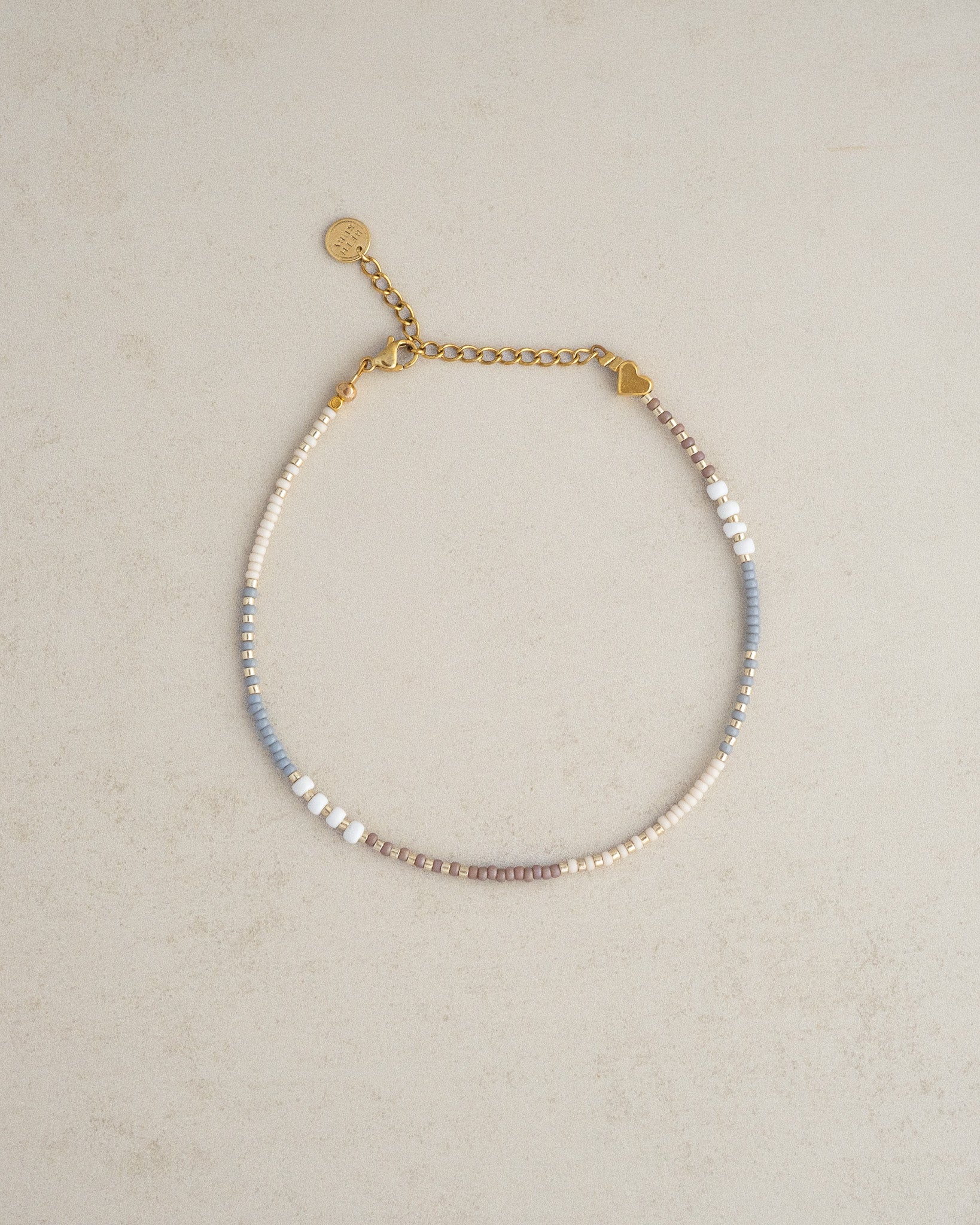 A mix of baby blue, white and taupe colored beads with golden touches.